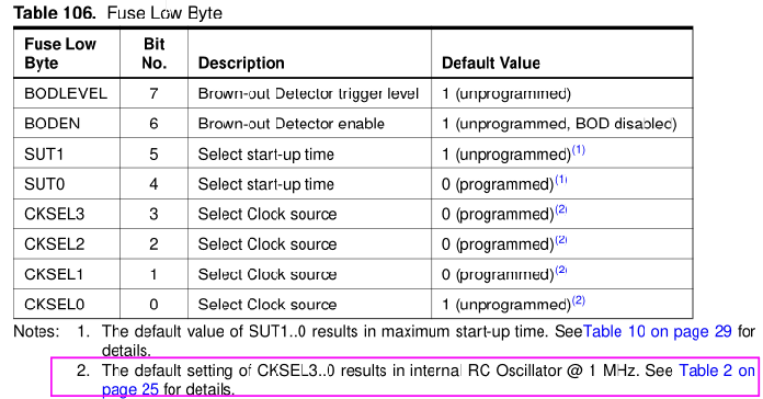>>dump lfuse // you can just type 'd lfuse' then to write to the fuse >>write lfuse 0 0xEF // this will set all bits of CKSEL to 1 ensuring the external Crystal will work >> d lfuse >> quit