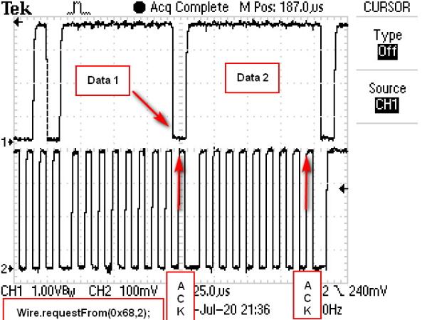 EXAMPLE 3 : Wire.request(0x68,2) Showing ACK sent from Arduino to signal Data requested has been received