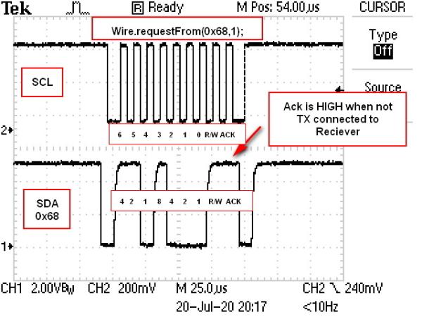 The Primary device, the Arduino, will toggle the I2C line, writing the address 0x68 to the line.