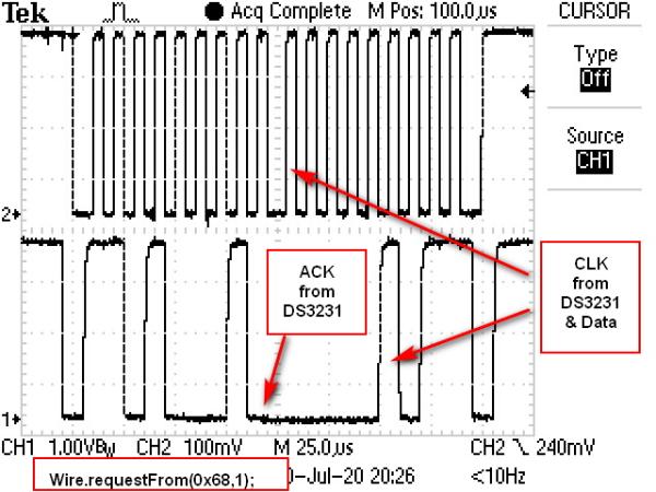 EXAMPLE 2 : Wire.request(0x68,1) Showing ACK sent from DS3231 in the Address Byte